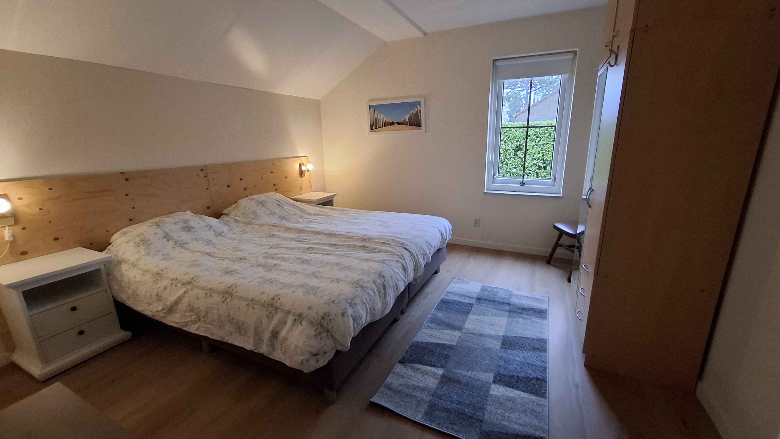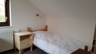 - Ruime slaapkamer met twee éénpersoons boxspring bedden met elk een dekbed (matrasmaat: 90×200). De bedden kunnen tegen elkaar aan geschoven worden. Ook is een hang-legkast aanwezig. Op deze kamer kan eventueel een stretcher of kinderbedje bijgeplaatst worden.