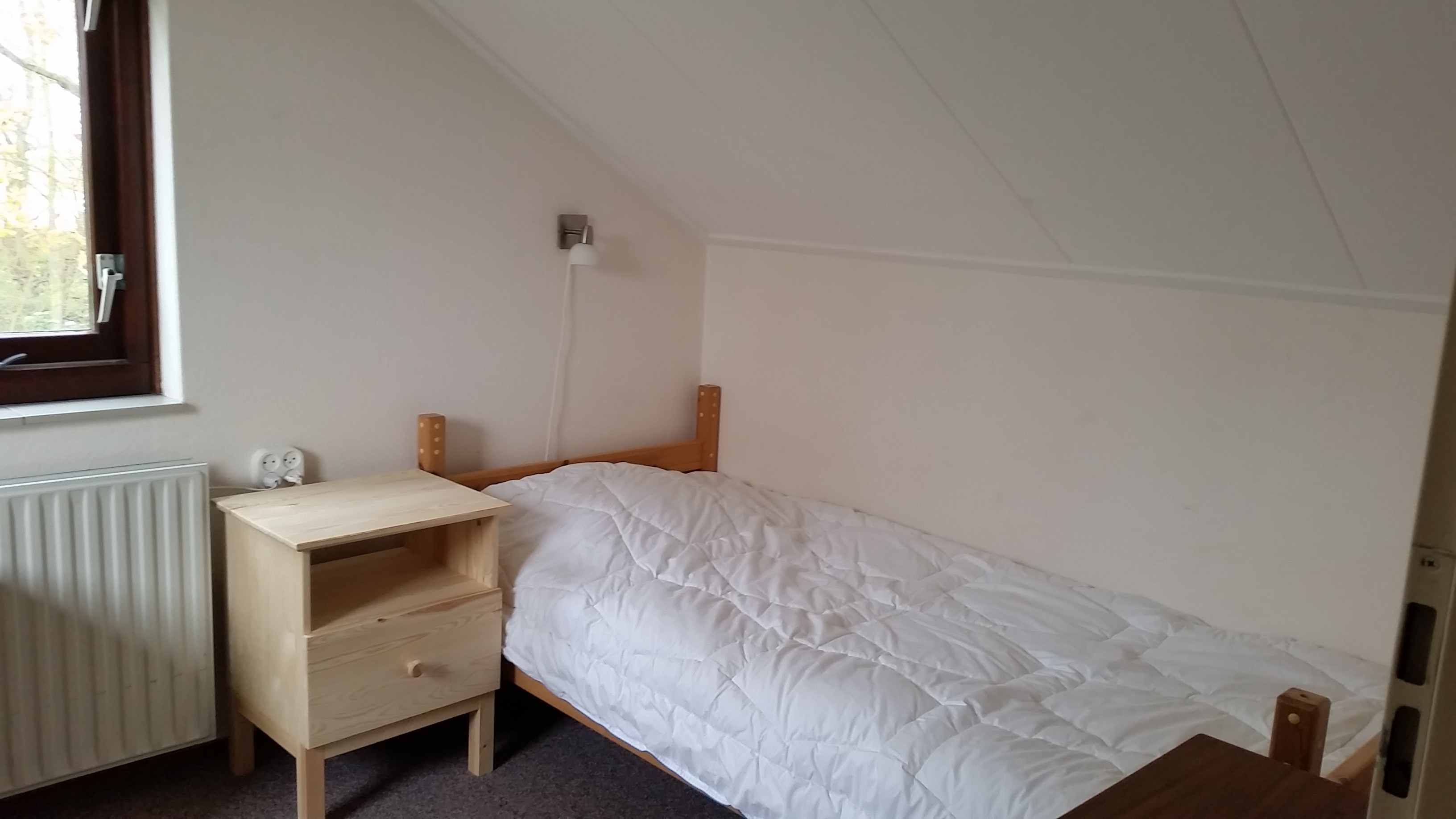- Slaapkamer met 2 éénpersoonsbedden met dekbedden (matrasmaat: 90×200) en een ladekast.
