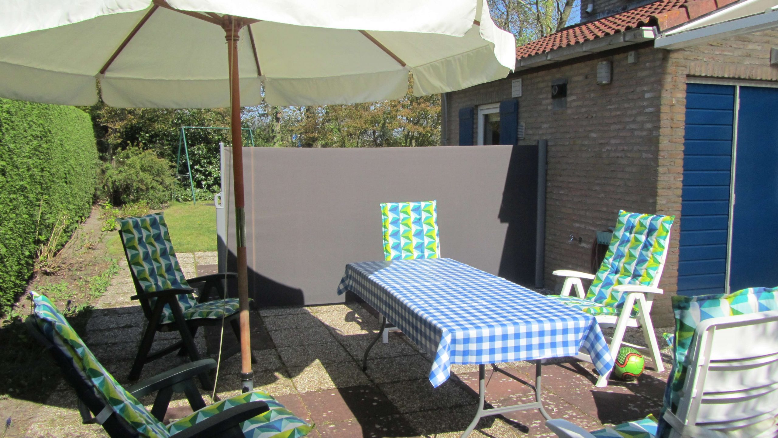 - Onder een mooie lichte veranda op het zuiden van het huis, of achter het uitrolbare windscherm op het terras, kunt u heerlijk beschut buiten zitten.