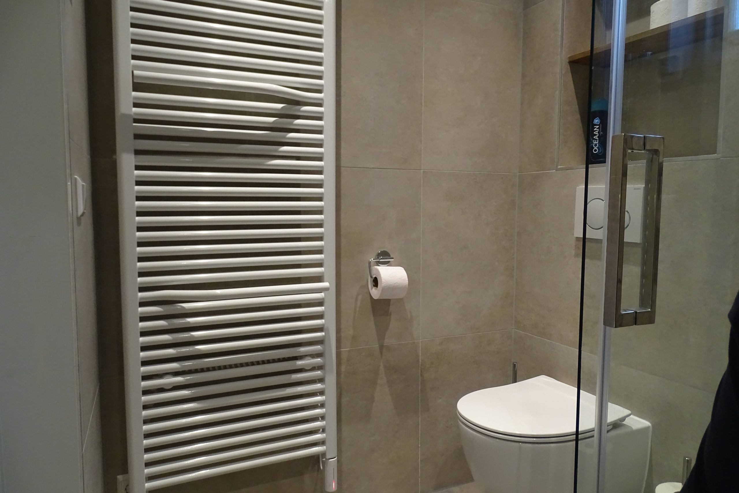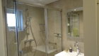 - Badkamer met douche, wastafel en WC.