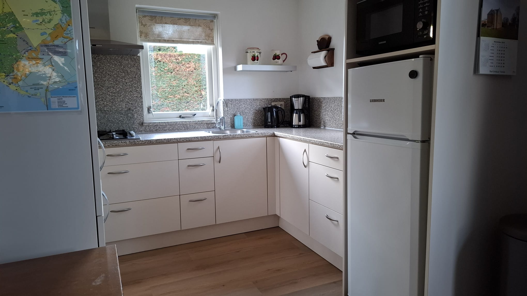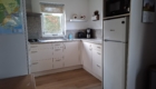 - Open keuken met ingebouwde gasplaat (4 pitten), grote koelkast met vriesvak, en een combi magnetron, koffiezetapparaat, Senseo, melkopschuimer, waterkoker, broodrooster en (staaf)mixer.