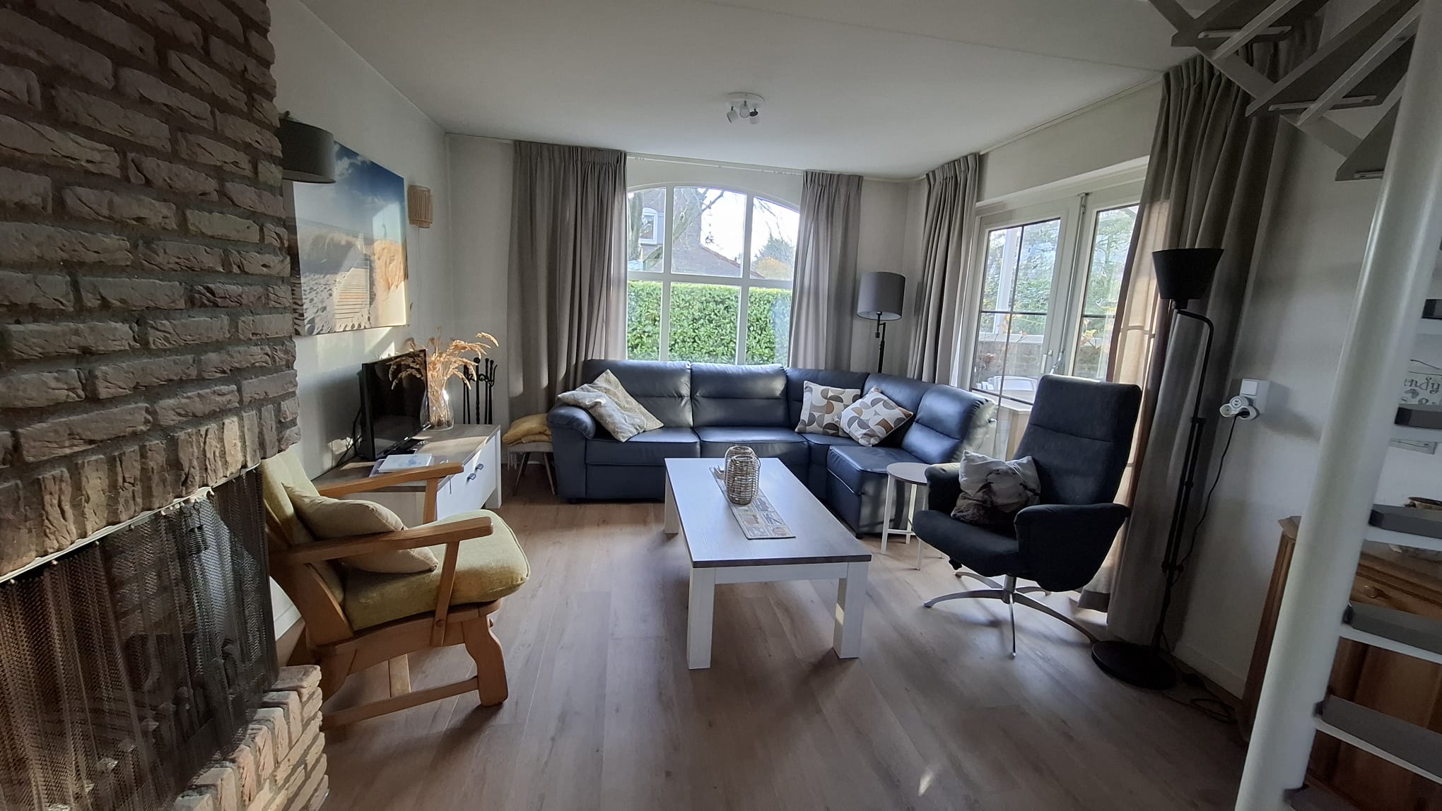 - Hal, L-vormige woonkamer met zithoek, openhaard, eettafel met zes stoelen.