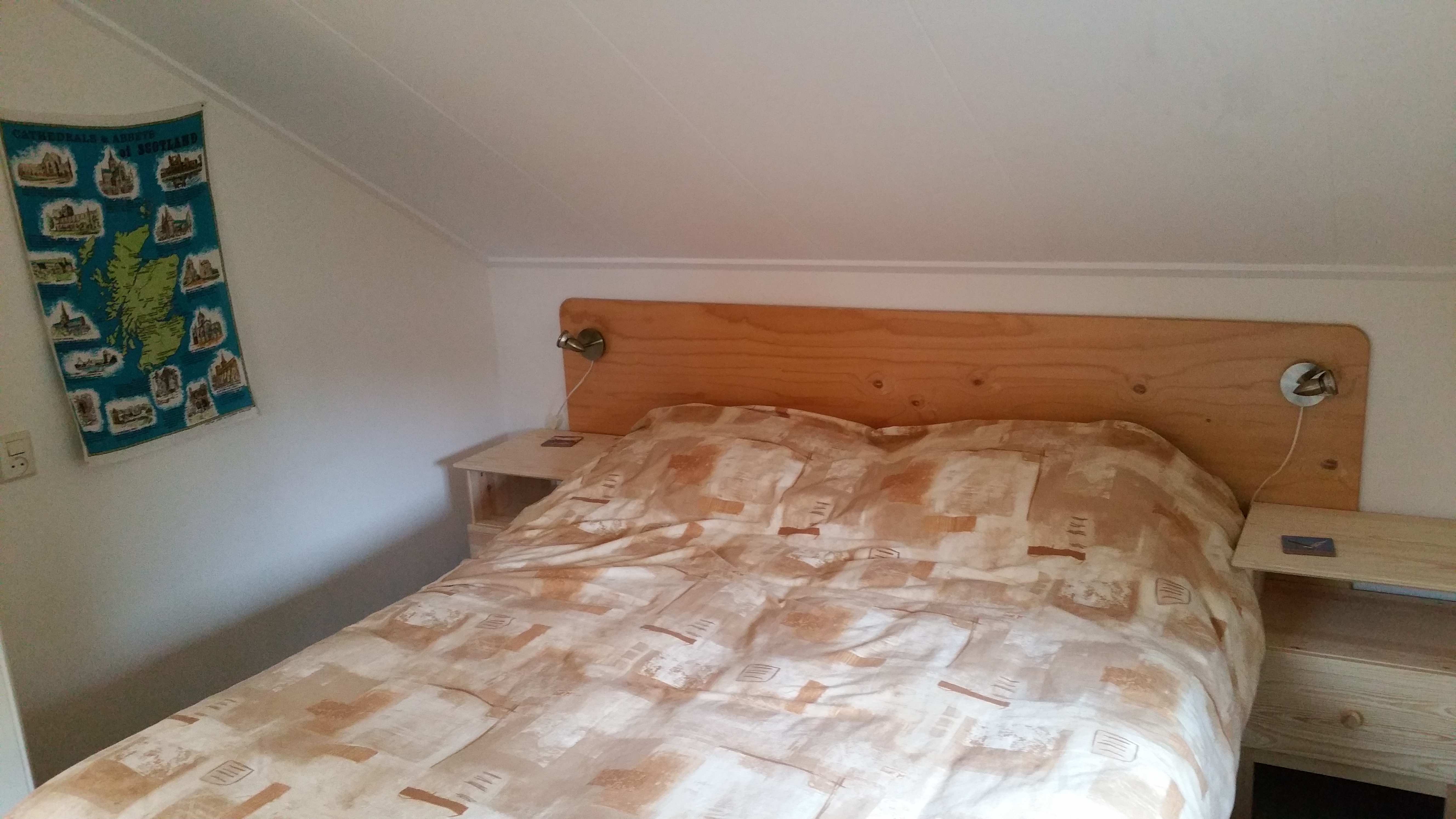 - Slaapkamer waarin een boxspring (lits-jumeaux: 2x 80×200) met één groot dekbed; de matrassen kunnen apart 80×200 of samen 160×200 worden opgemaakt. Er is een wastafel en een legkast met föhn.